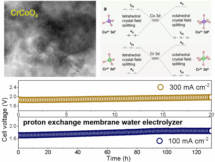 氢能作为一种清洁、可再生且可持续的能源载体,被广泛认为是应对全球能源危机与环境污染的理想途径,在实现碳中和战略中具有不可替代的作用。CrCoOx 在碱性体系中已展现出优异的活性与稳定性,其在酸性环境下仍普遍存在溶解、结构坍塌及活性衰退等问题,导致其长期运行性能远不及贵金属体系。如何在酸性条件下实现活性与稳定性的双重突破,仍是酸性OER研究亟待解决的核心科学问题。近期李杲&张静静团队通过向氧化钴中掺杂铬,成功引入了丰富的氧空位,并形成了可逆的 Co/Cr 氧化还原对及表面羟基,从而显著增强了材料对氧中间体的吸附与活化能力。得益于优异的结构和电学特性,CrCoOx 在酸性氧析出反应中表现出优异的催化活性与稳定性,进一步推动了其在高性能 PEMWE 中的应用潜力:在酸性条件下可实现 100 mA·cm-2 的高电流密度,并稳定运行达 130 小时。原位光谱结合DFT计算揭示了 Cr 掺杂在调控反应机理与电子结构中的关键作用。该研究成果展示了 CrCoOx 在酸性环境下兼具高活性与高稳定性的非贵金属催化特性,为高效、低成本的质子交换膜电解水制氢技术提供了新的设计思路和实践依据,为未来工业化应用奠定了重要基础。