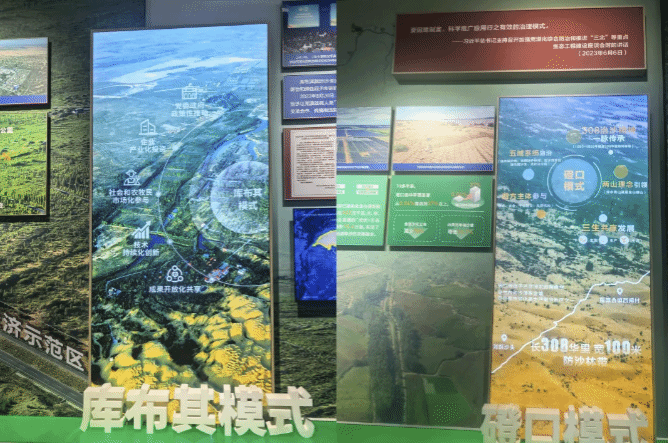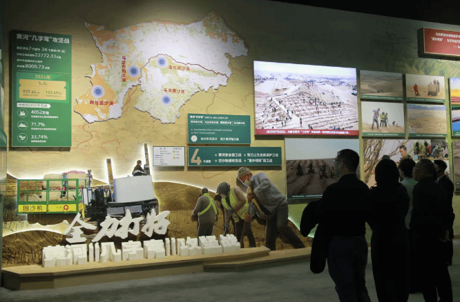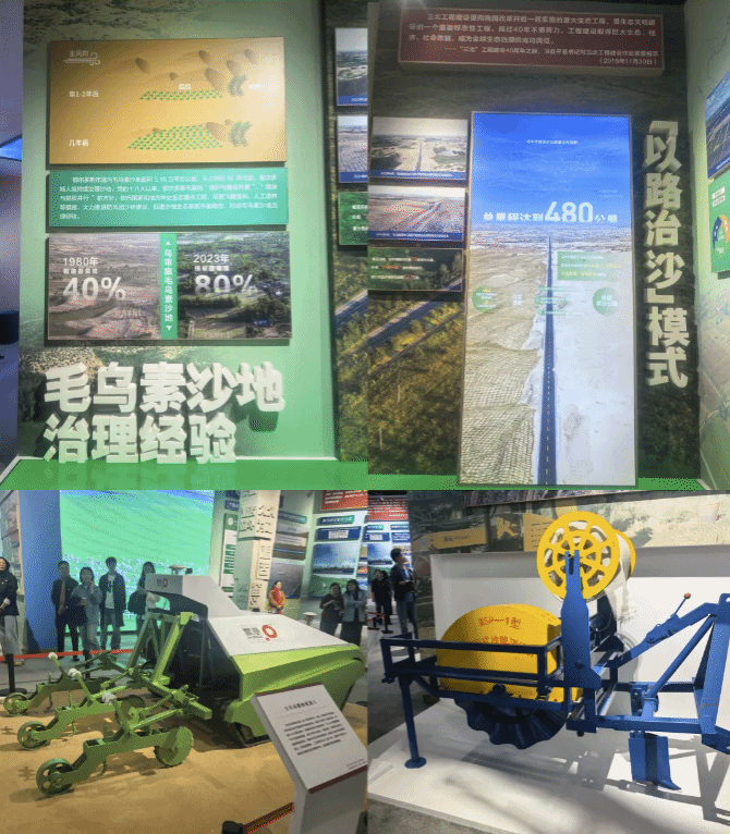 主题展深入宣传贯彻习近平总书记在加强荒漠化综合防治和推进“三北”等重点生态工程建设座谈会上重要讲话精神,紧紧围绕“绿色长城 生态奇迹”的主题,由“牵挂‘三北’ 殷殷嘱托”、“不负重托 挺膺担当”、“鏖战‘三北’ 绿润北疆”、“科学治理 守正创新”、“‘三北’精神 赓续传承”五个部分组成,在展厅内,一幅幅珍贵的历史图片、一组组详实的数据图表、一件件承载记忆的实物展品,生动再现了内蒙古自治区党委带领各族干部群众在防沙治沙和“三北”工程建设中攻坚克难的奋斗历程。从荒漠变绿洲的沧桑巨变,到科技治沙的创新实践;从几代人接续奋斗的感人事迹,到生态与经济协同发展的丰硕成果,全方位展现了内蒙古构筑我国北方重要生态安全屏障的坚定决心与显著成效。